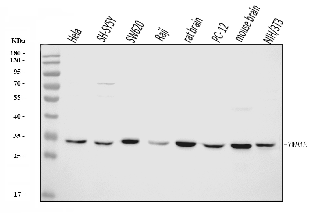 Western blot analysis of 14-3-3 Epsilon/YWHAE using anti-14-3-3 Epsilon/YWHAE antibody (M01687-2). The sample well of each lane was loaded with 30 ug of sample under reducing conditions.