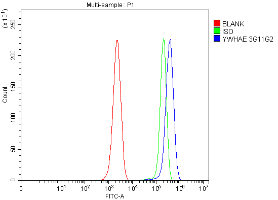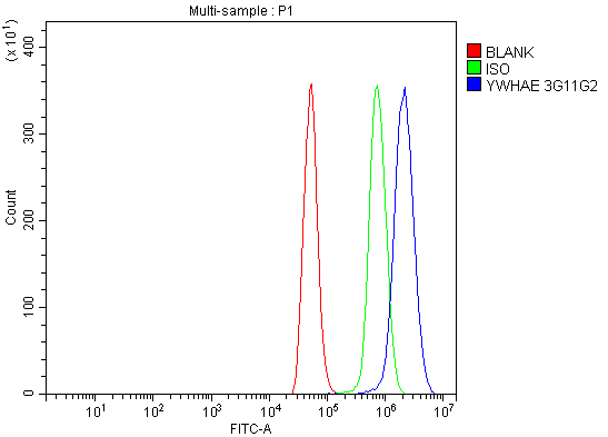Overlay histogram showing ANA-1 cells stained with M01687-2 (Blue line). To facilitate intracellular staining, cells were fixed with 4% paraformaldehyde and permeabilized with permeabilization buffer. The cells were blocked with 10% normal goat serum. And then incubated with mouse anti-14-3-3 Epsilon/YWHAE Antibody (M01687-2) at 1:100 dilution for 30 min at 20°C. Fluoro488 conjugated goat anti-mouse IgG (BA1126) was used as secondary antibody at 1:100 dilution for 30 minutes at 20°C. Isotype control antibody (Green line) was mouse IgG at 1:100 dilution used under the same conditions. Unlabelled sample without incubation with primary antibody and secondary antibody (Red line) was used as a blank control.